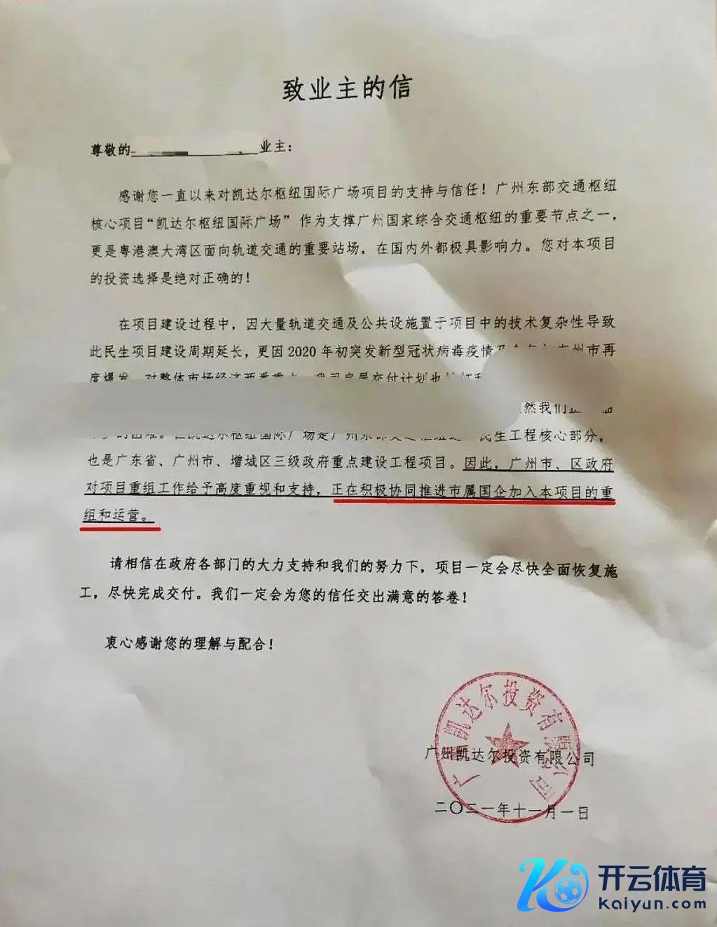 2021年11月1日,广州凯达尔投资有限公司给业主发送了一封信,信中所提到的面貌等于位于新塘的凯达尔关节外洋广场。